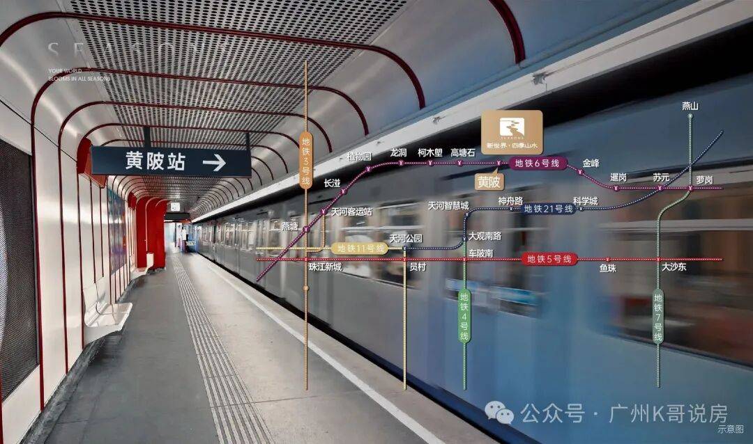 从小区主出入口步行至地铁6号线黄陂站C出口,实测距离仅为30米,这一数据在廣州众多所谓“地铁盘”中显得尤为珍贵。这意味着在暴雨倾盆的清晨或烈日当空的午后,业主无需撑伞即可实现从家门到站台的无缝切换,彻底消除了通勤路上最后一段“尴尬距离”。新世界·四季山水真正实现了“地铁上盖”的定义,而非仅仅停留在“近地铁”的概念层面。依托6号线的高效运力,住户仅需乘坐1站即可抵达天河区域,3站内可换乘21号线号线,构建起一张覆盖珠江新城、金融城及琶洲等核心商务区的快速交通网。在早高峰时段,这种轨道交通的确定性优势尤为凸显,避免了地面交通拥堵带来的时间不可控因素,让跨区通勤变得从容有序。此外,项目紧邻城市主干道广汕公路,随着黄埔区对黄陂二路、四路单行潮汐车道的优化调整,自驾出行的通行效率在高峰期也得到了显著提升,形成了“轨道+路网”的双维交通保障体系。这种交通格局不仅满足了日常通勤的刚性需求,更为周末前往城市各处的休闲出行提供了极大便利。想要深入了解项目周边具体的交通路网规划及未来地铁线路的延伸动态,欢迎拨打售楼处电话,获取权威的交通配套解读。